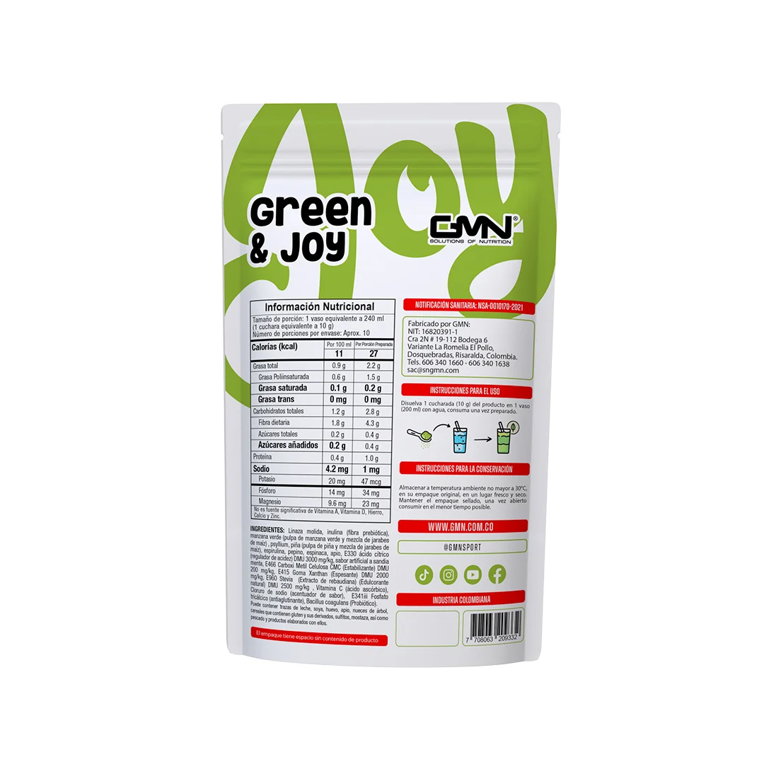 Alimento en polvo para preparar bebida a base de linaza e inulina, buena fuente de fibra, bajo en calorías, muy bajo en sodio, con manzana verde, psyllium, piña, espirulina pepino, espinaca y apio con sabor artificial a sandía menta.