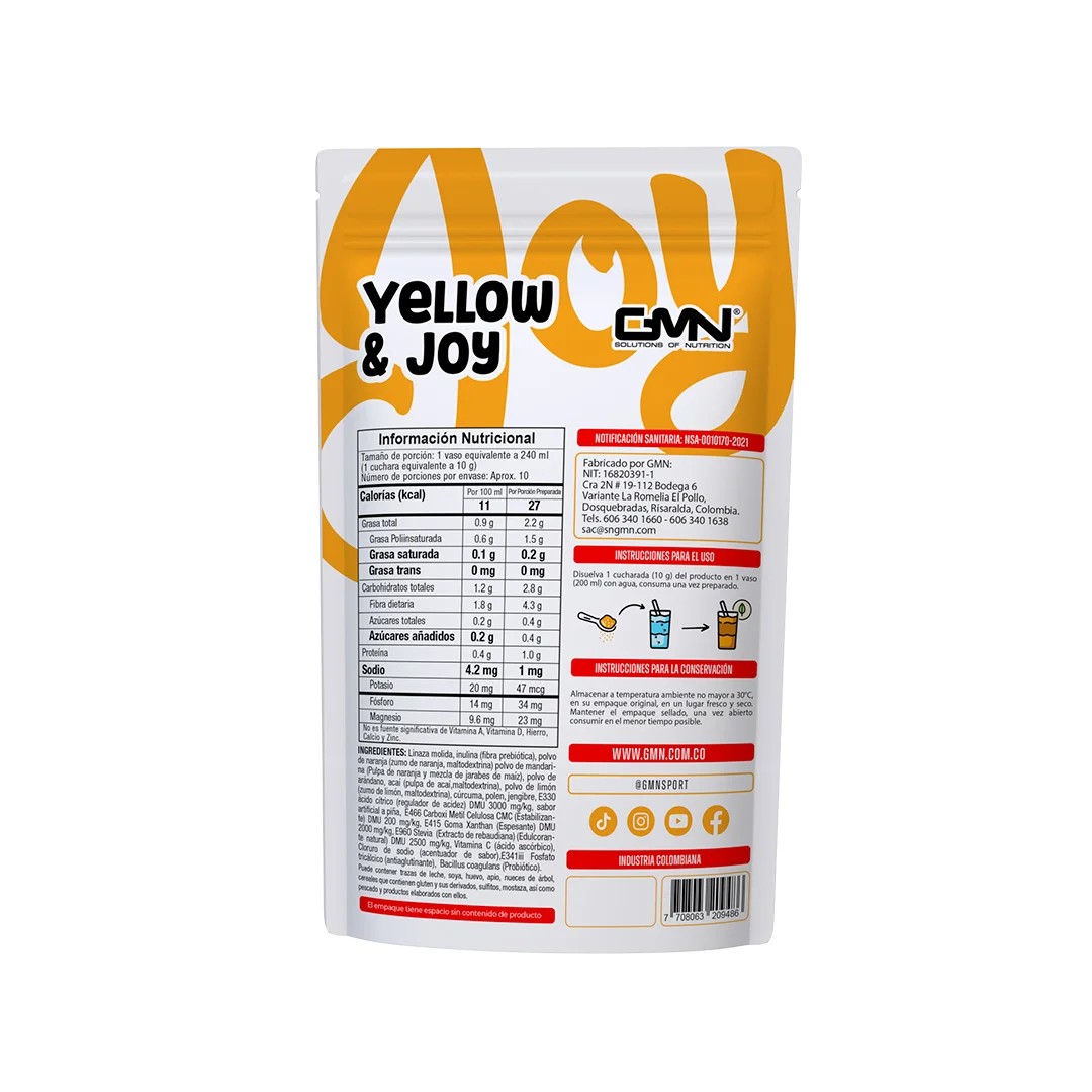 Alimento en polvo para preparar bebida a base de linaza e inulina, buena fuente de fibra, bajo en calorías, muy bajo en sodio, con naranja, mandarina, arándano, acai, limón, cúrcuma, polen y jengibre con sabor artificial a piña.